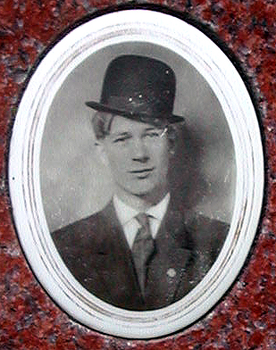 Gravestone portrait of Barney Rostkowski. He is wearing a derby hat, tilted at an angle, and a coat and tie. He is very young.