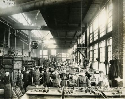 Photo from 1905, showing workers in a factory room. It looks very rudimentary, with a lot of windows, and rough tools and clothes.