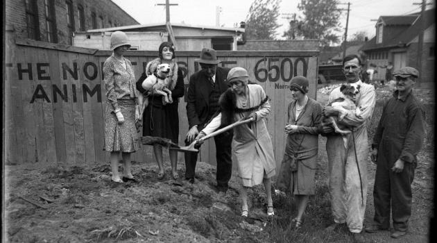 Groundbreaking for the shelter at 6500 N. Clark St. Dorothy is second from left, holding the dog. Chicago Tribune; 28 May 1929.