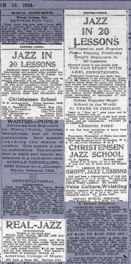 Previous Image Next Image Jazz Want Ads; Chicago Tribune; Oct. 12, 1924; p. 109 Jazz Want Ads; Chicago Tribune; Oct. 12, 1924