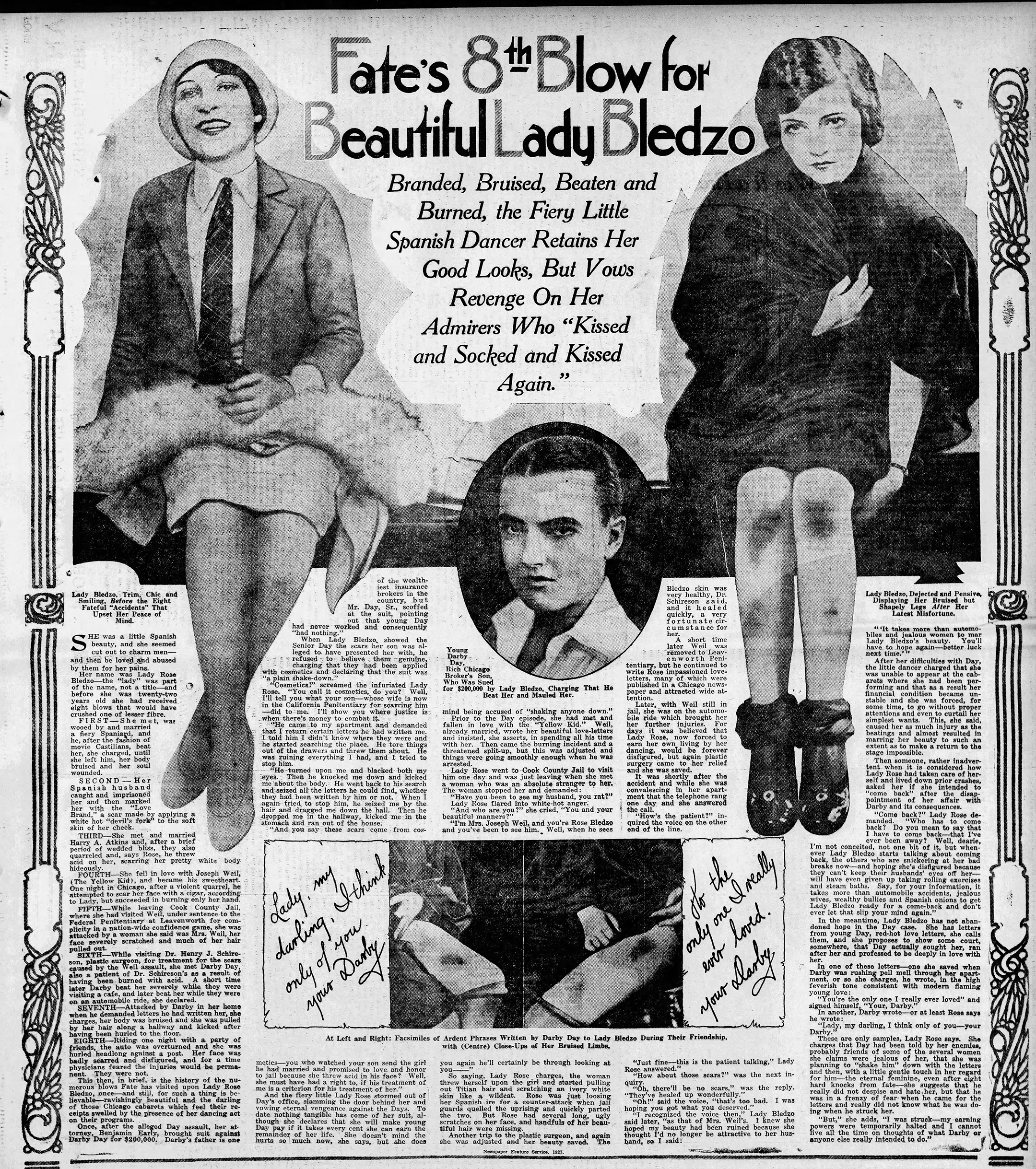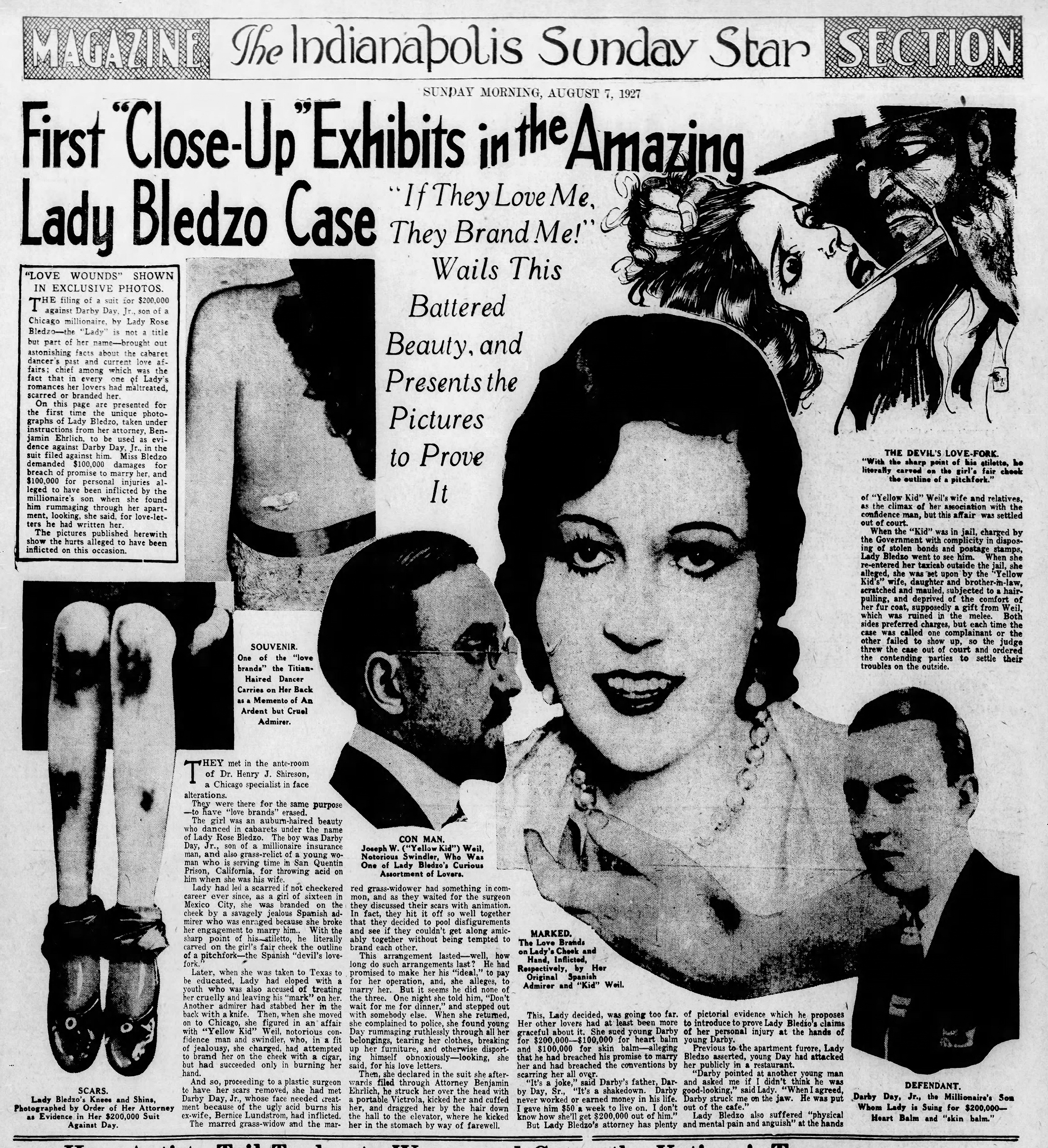 The most powerful force in Lady Bledzo’s corner seems to have been International Feature Service, the same Hearst organization that had featured her in its splashy 1925 articles about Yellow Kid Weil. During the summer of 1927, IFS ran at least three separate features about Lady Bledzo. They were designed for inserts in Sunday newspapers, with eye-catching visuals and highly sympathetic writing. The articles tout “exclusive photos” of Lady Bledzo’s graphic injuries, so we can guess that a bargain was struck and she cooperated fully.