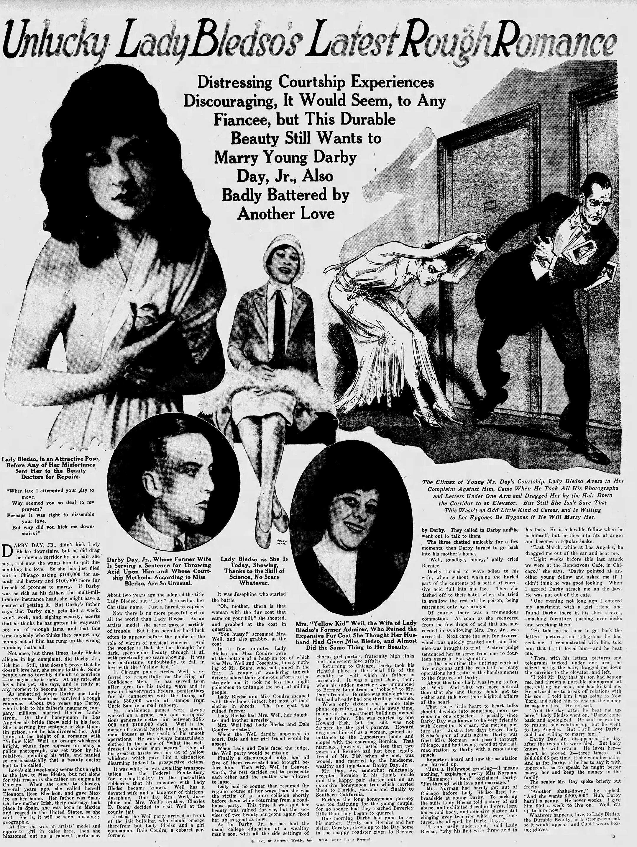 On the upside: Lady Bledzo was now the star. In 1925, when the IFS stories were about Weil, she had been the strumpet. Now she was the injured lover/jilted fiancée. It was a better seat to have, for sure. (And yet, if you read the articles, you’ll note that at least a third of each is just about Darby or Weil, not about her at all.)