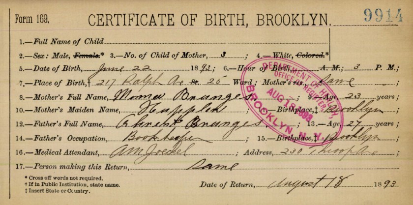 This Brooklyn stoop romance of Willam and Elise features the great-grandmother I discussed in this post. Their marriage got a brief 7 years; the influenza took her in 1918. Piecing together her family line has been my proudest work, but also slow going. There have been many, many Brunjes (or Brunges, or Brünjes) in Brooklyn over the decades, and I’ve never been able to untangle their lines. With these newly available documents, maybe I could.