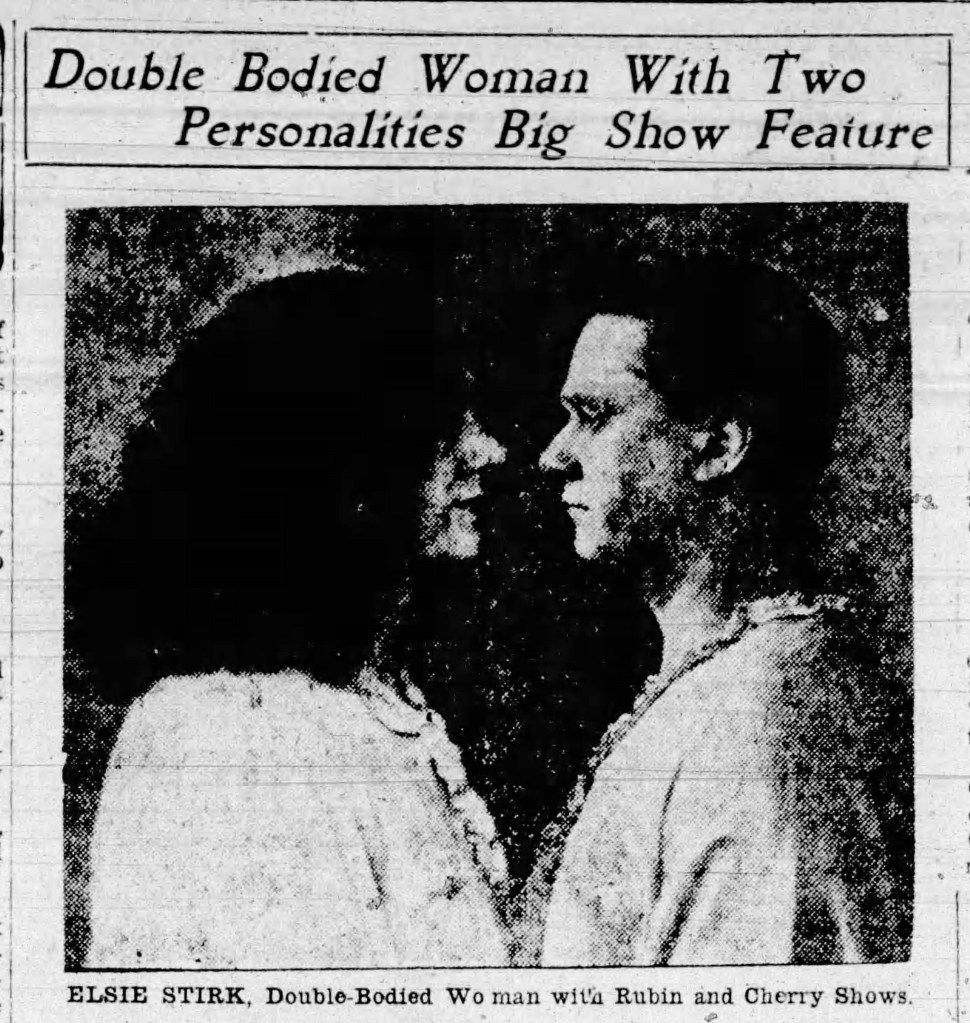 Elsie deserves, and eventually will get, her own place on this blog. But in brief: Elsie was a 1900s vaudeville performer who worked as a female impersonator, and specialized in impersonations, voices, and trapeze stunts. Later she moved to carnivals as a “half-and-half” act—half man/half woman.