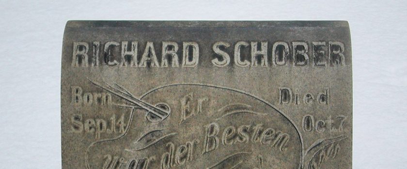 Richard Schober’s Headstone at Graceland Cemetery in Chicago. It is small and rectangular and gray. It has an artist’s palette and brushes, along with name and dates.