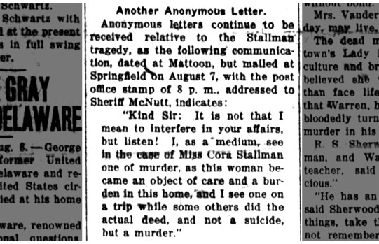 Previous Image Next Image Journal_Gazette_Sat__Aug_8__1925_medium letter Anonymous letter sent to the coroner’s office. Mattoon Daily Journal Gazette; Aug. 8, 1925